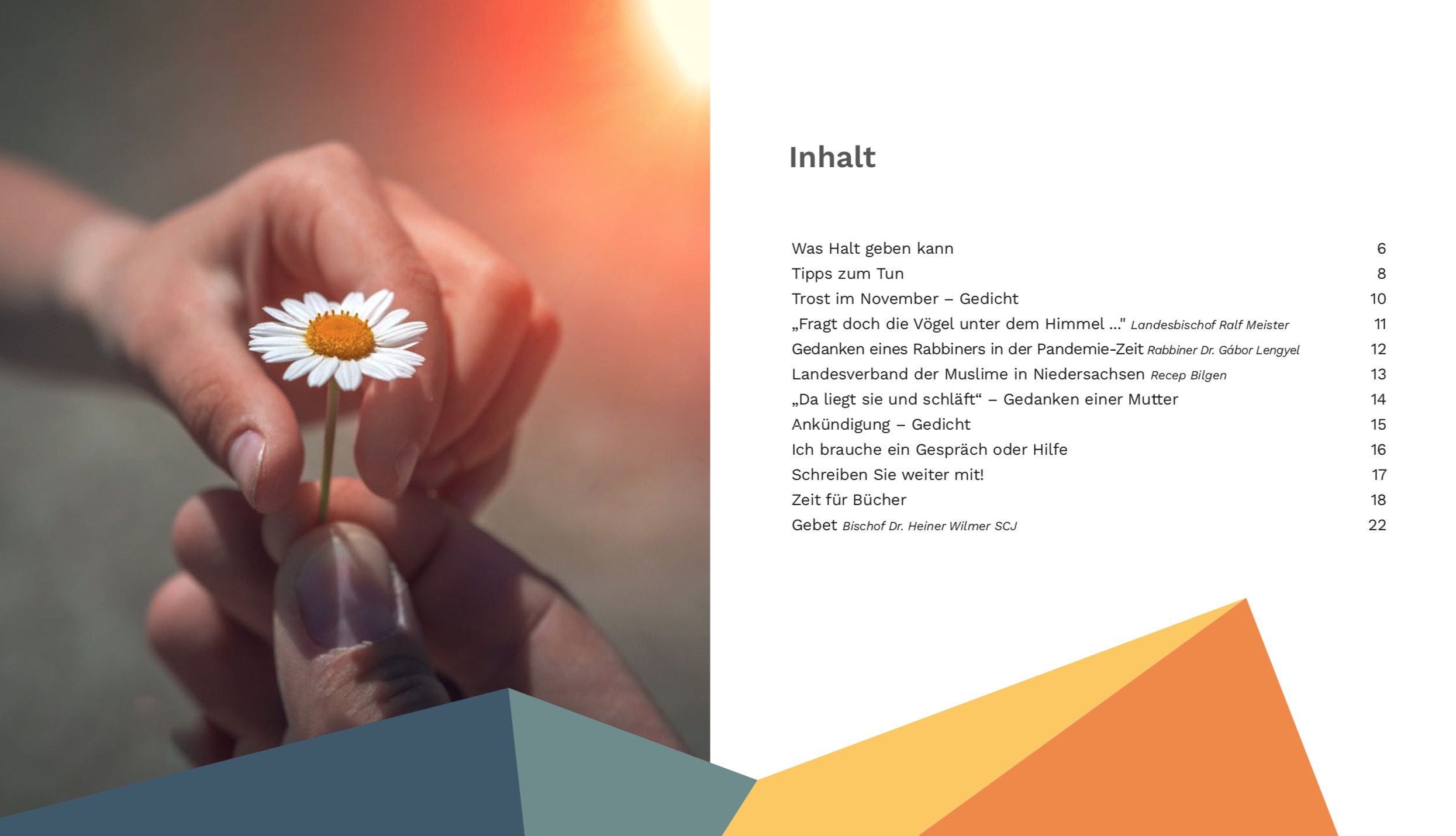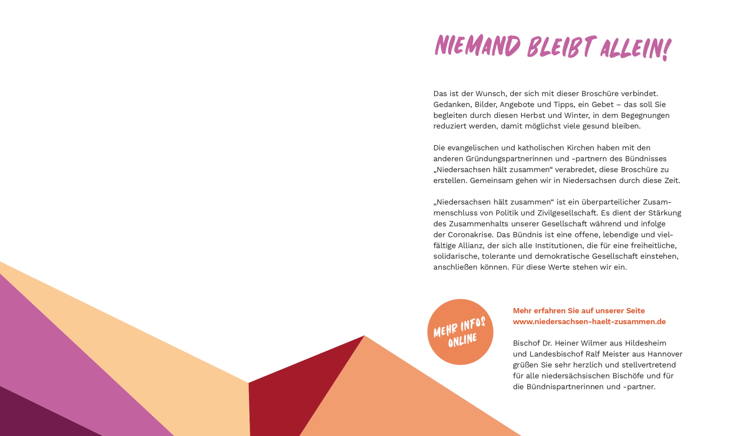 "Niedersachsen hält zusammen" ist ein überparteilicher Zusammenschluss von Politik und Zivilgesellschaft. Es dient der Stärkung des Zusammenhalts unserer Geselschaft während und infolge der Coronakrise. Die evangelischen und katholischen Kirchen haben mit den anderen Gründungspartnerinnen- und --partnern des Bündnisses verabredet, diese Broschüre zu erstellen. Gemeinsam gehen wir in Niedersachsen durch diese Zeit.
