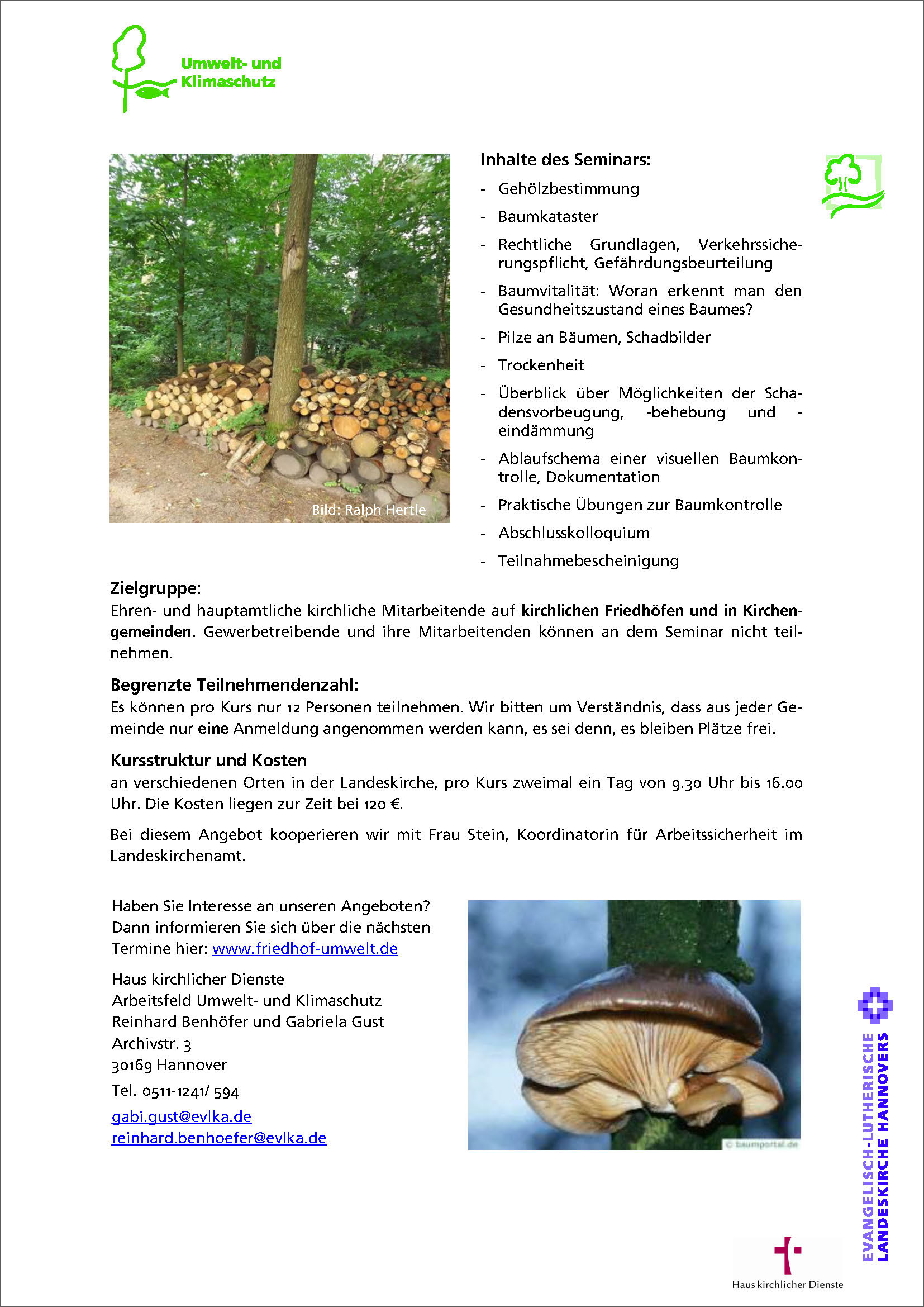 Aus diesem Grund bieten wir ehren- und hauptamtlichen kirchlichen Mitarbeitenden ein zweitägiges Seminar an, auf dem sie von einem ausgebildeten Baumprüfer, Gartenbauingenieur und Friedhofsgärtner befähigt werden, visuelle Baumkontrollen durchzuführen.