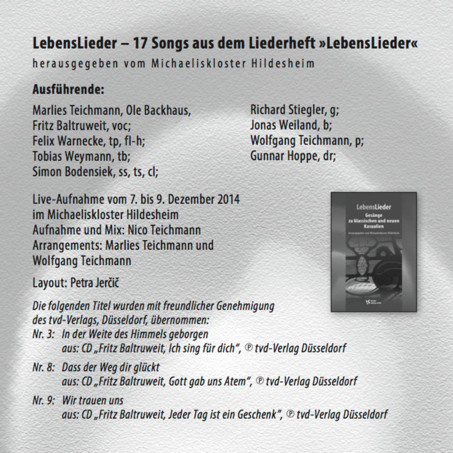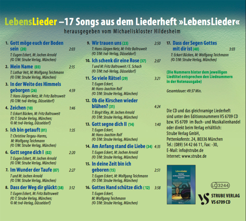 Deshalb haben sich Musikerinnen und Musiker aus dem Umfeld des Michaelisklosters daran gemacht, eine Auswahl von 17 Liedern aus dem Liederheft „Lebenslieder“ aufzunehmen.