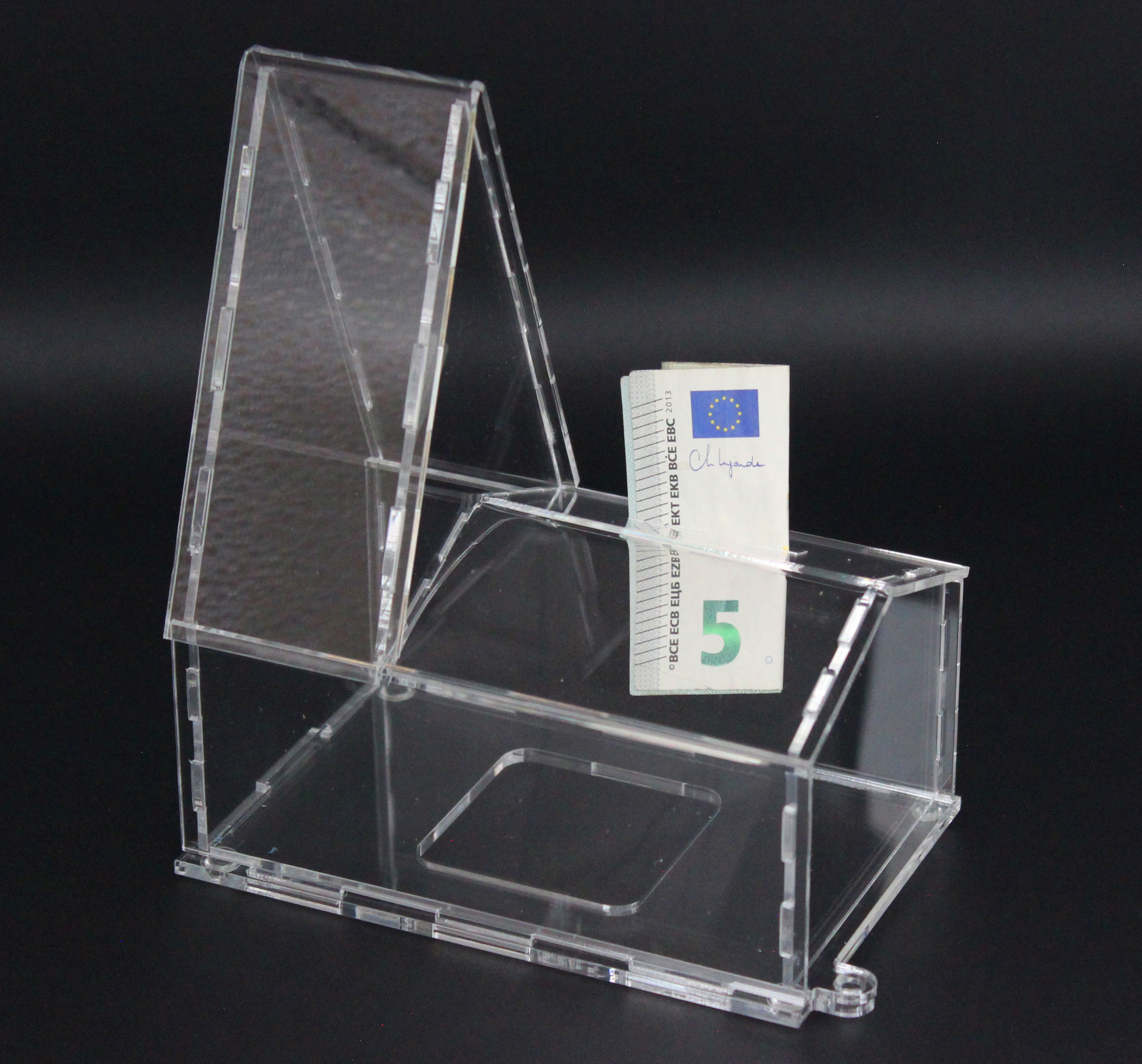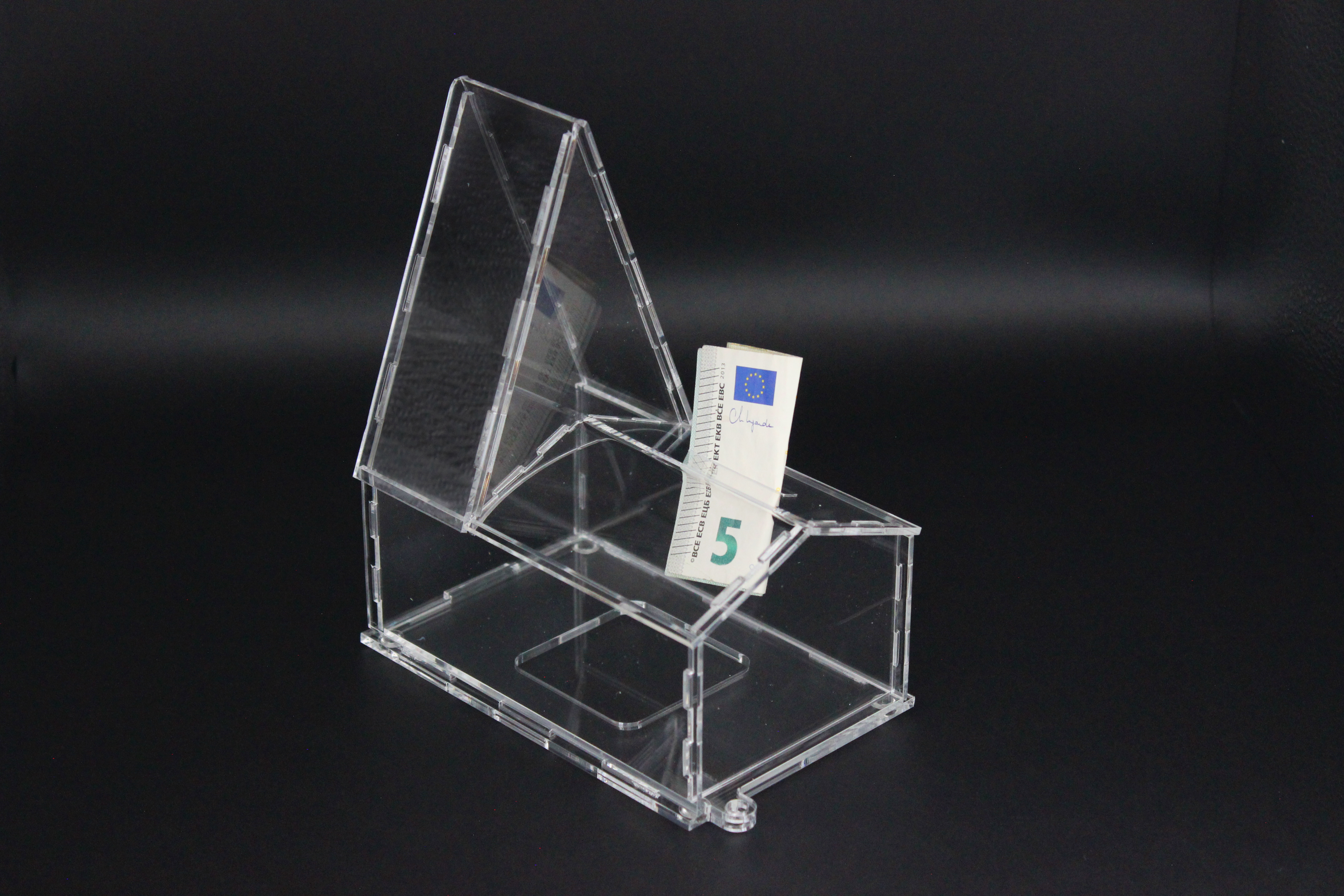 Spendendose aus Acryl in Form einer Kirche, mit Schlitz für den Geldeinwurf. Eignet sich perfekt zum Aufstellen für Anlassspenden.