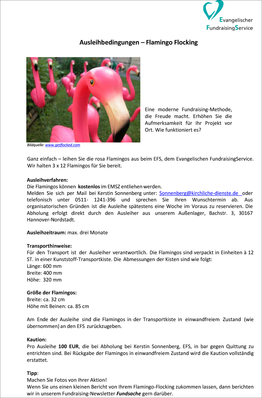 Set á 3 Kisten mit je 12 Flamingos stehen zum Ausleihen an Kirchengemeinden und Einrichtungen innerhalb unserer Landeskirchezur Verfügung. Die Abholung erfolgt direkt durch den Entleiher.
